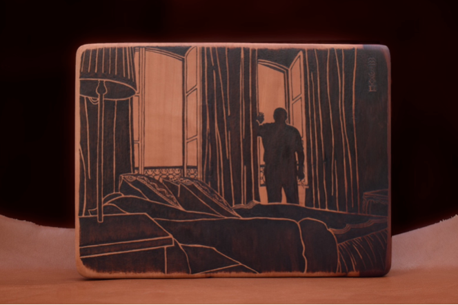 Pyrografie, een kunstvorm waarbij hout met hitte wordt bewerkt.